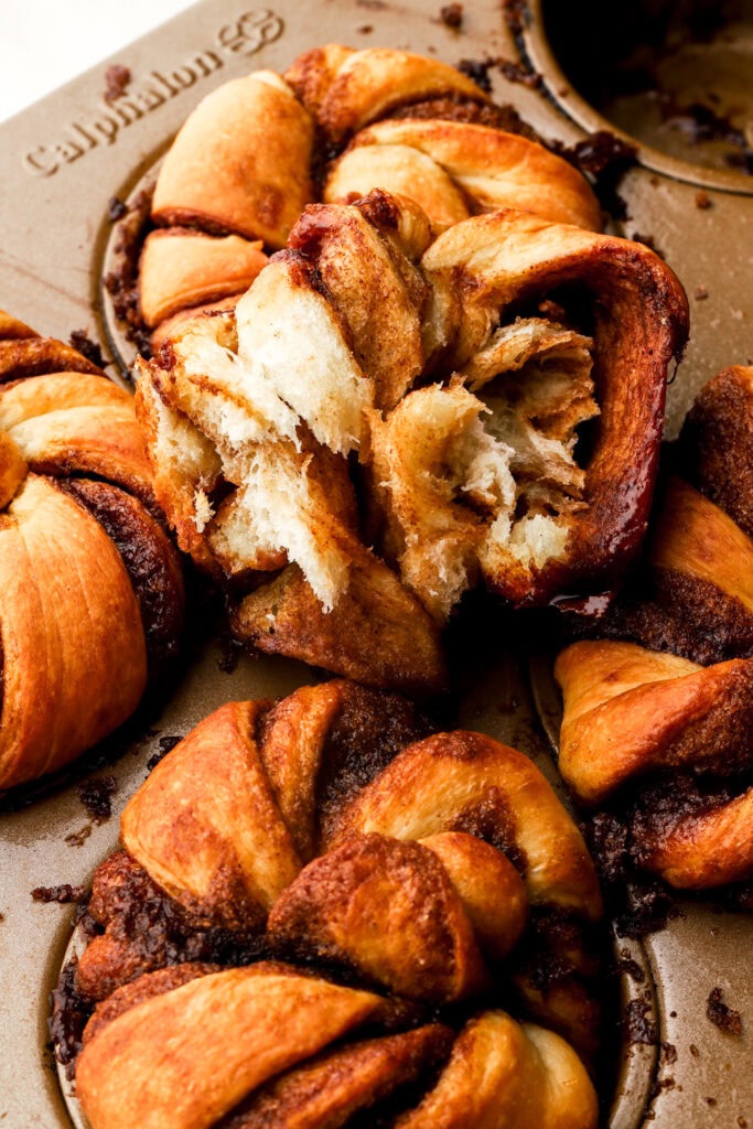 These are made using my favorite fluffy brioche dough rolled around brown sugar and cinnamon, of course. But instead, theyโre sliced, twisted, knotted and baked in a muffin pan.
