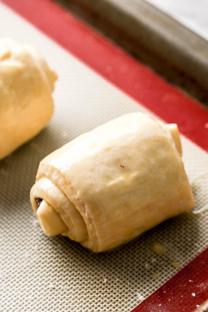Yes! You can actually use up to twice as much chocolate for each slice for a richer croissant. Place the chocolate on the end like I did, then fold the dough over the piece of chocolate and place another piece of chocolate and continue rolling.