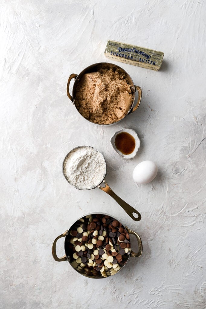 Think chocolate chip skillet cookie with brown butter, white chocolate, milk chocolate and dark chocolate chips! Perfectly caramelized edges and a warm, gooey center, a perfect bed for vanilla ice cream!