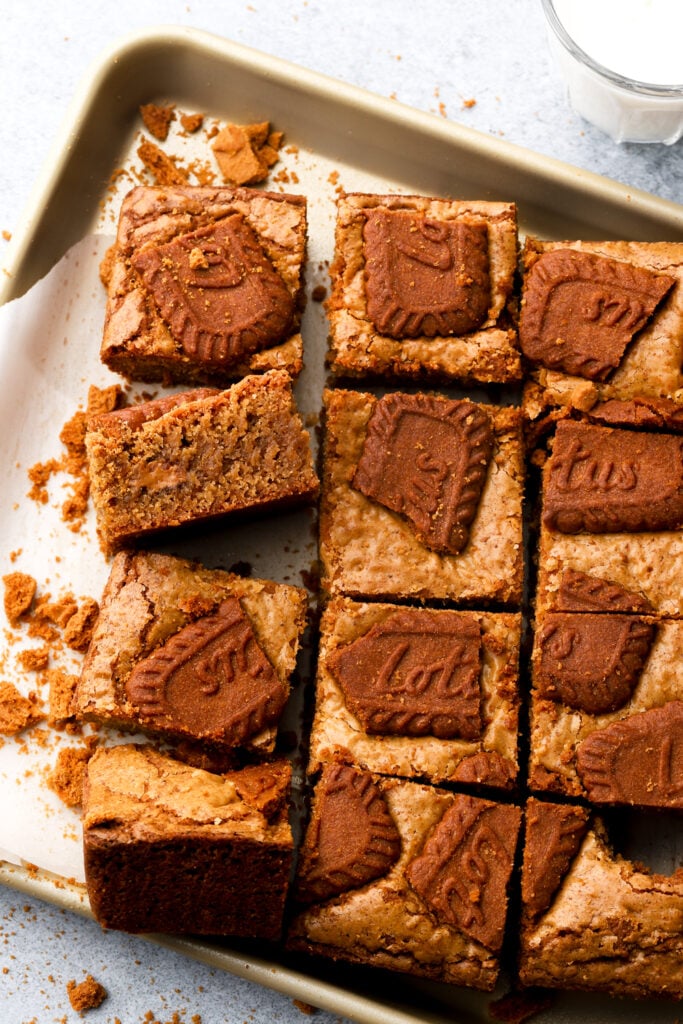 Thick and chewy biscoff blondies are made with cookie butter and biscoff crumbs in the batter, swirled with cookie butter globs and topped with crunchy biscoff cookies.