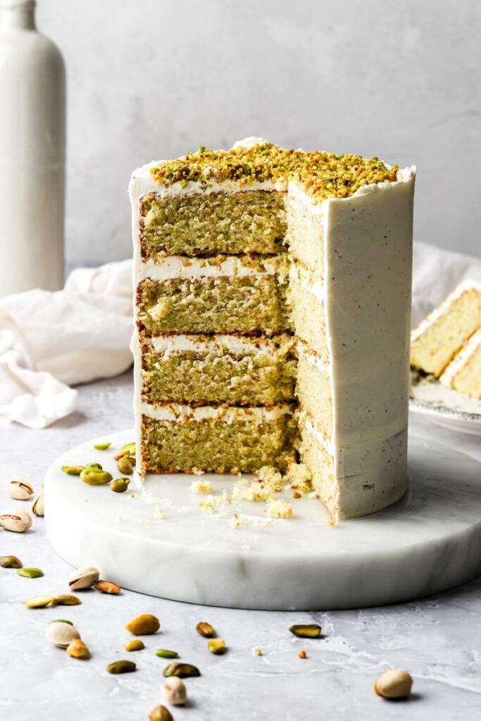 Pistachio cake made with real pistachios, no artificial flavors or colors, frosted with silky white chocolate Swiss meringue buttercream and chopped pistachios between the layers.