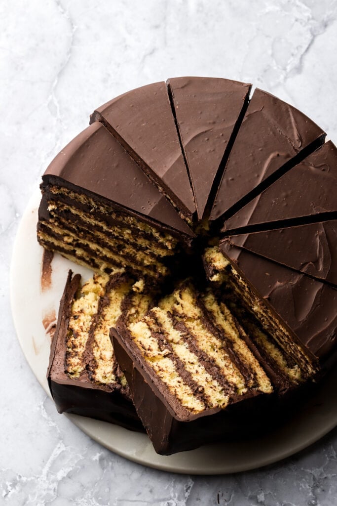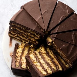 Prinzregententorte is a traditional Bavarian and German torte made from thin layers of genoise sponge and frosted with a dark chocolate creme mousseline. Itโs generally topped with a chocolate glaze that I turned into a chocolate magic shell for a nice change in texture!
