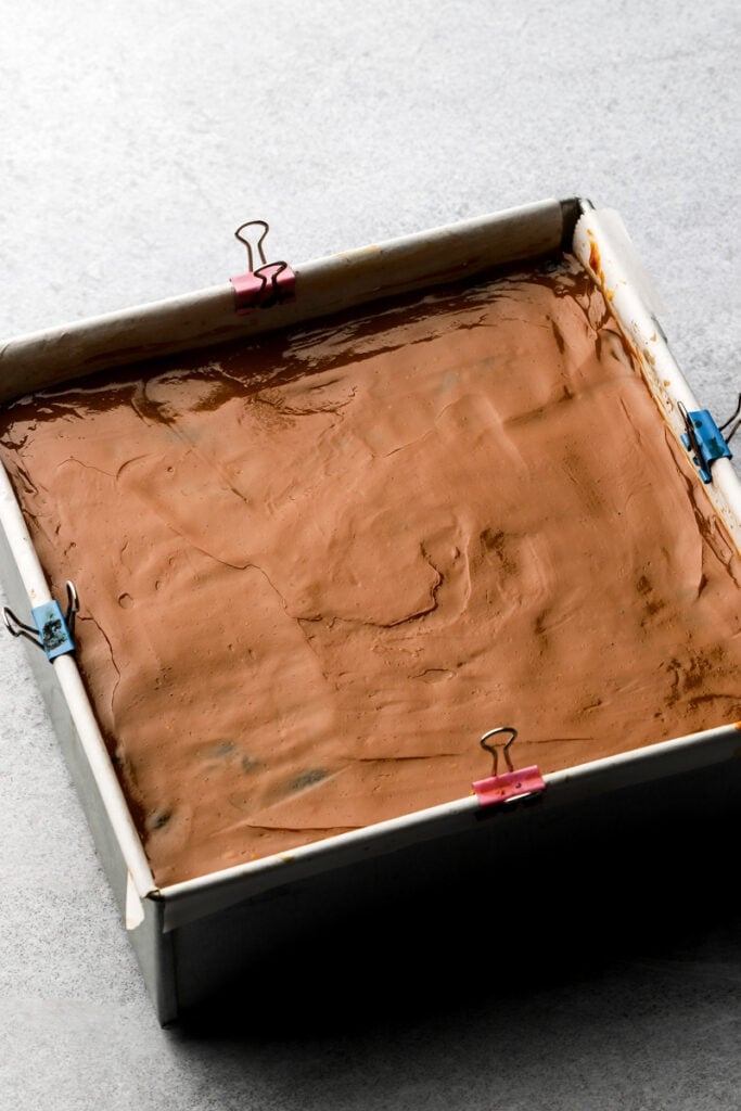 I used two long pieces of parchment paper to line my square pan and I left an overhang on both sides, clipped with a binder clip so I can easily remove the cake, just like I did when baking the layers