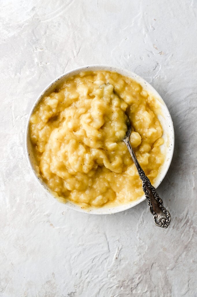 375g is about 3 medium-large bananas, and if you have a little under (like 350-360g) you can add a couple tablespoons of water. If you donโt have a scale you can also measure it by cup. Itโs about 1 ยฝ cups when itโs all mashed and if you have a little under you can add water.