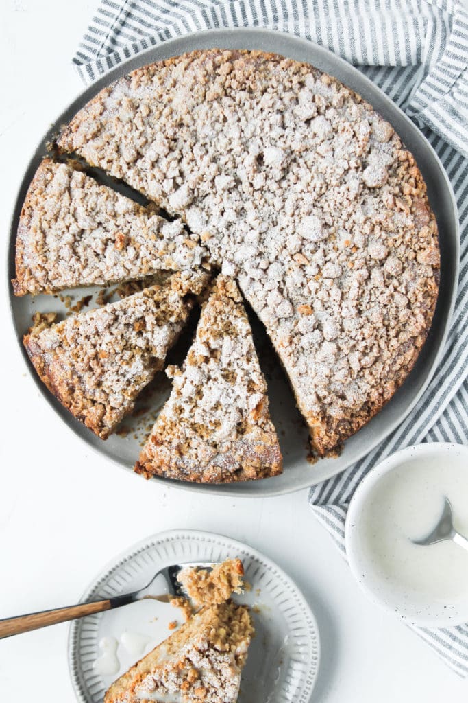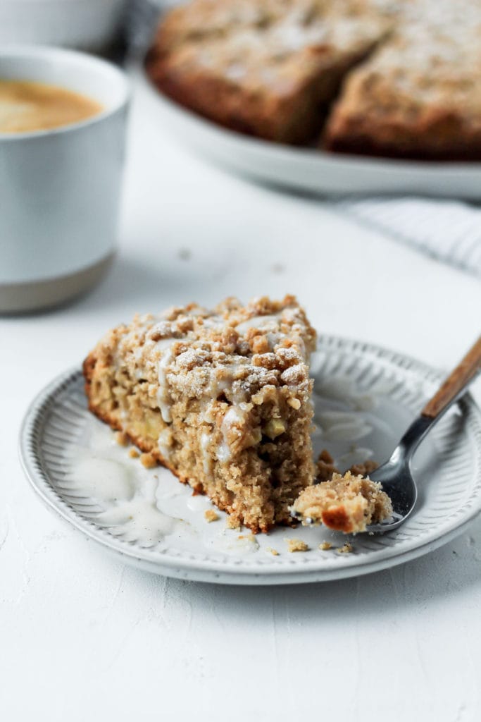 The icing on top is super easy to make and just really dresses up this apple cinnamon coffee cake. It always looks nice with a little drizzle on top and the texture is a nice balance to the crispy streusel.