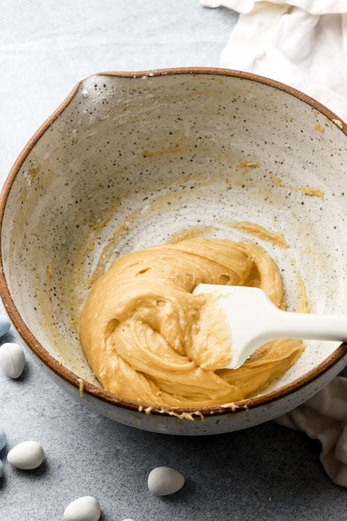 Step 2: Melt the butter and combine it with the light brown sugar, vanilla and egg. Whisk it aggressively for a few minutes, until itโs completely smooth and has lightened in color.