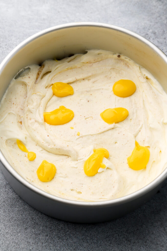 Step 9: Spread half the ice cream into a deep pan and drop globs of lemon curd and brown butter. Use a knife to swirl.