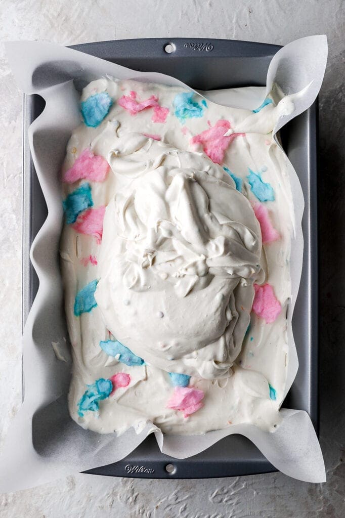 I also really wanted to include real cotton candy in the recipe so I went out and got some cotton candy and mixed it right in. I had no idea how it would freeze but it mostly just dissolves and gives you a concentrated area of cotton candy goodness.