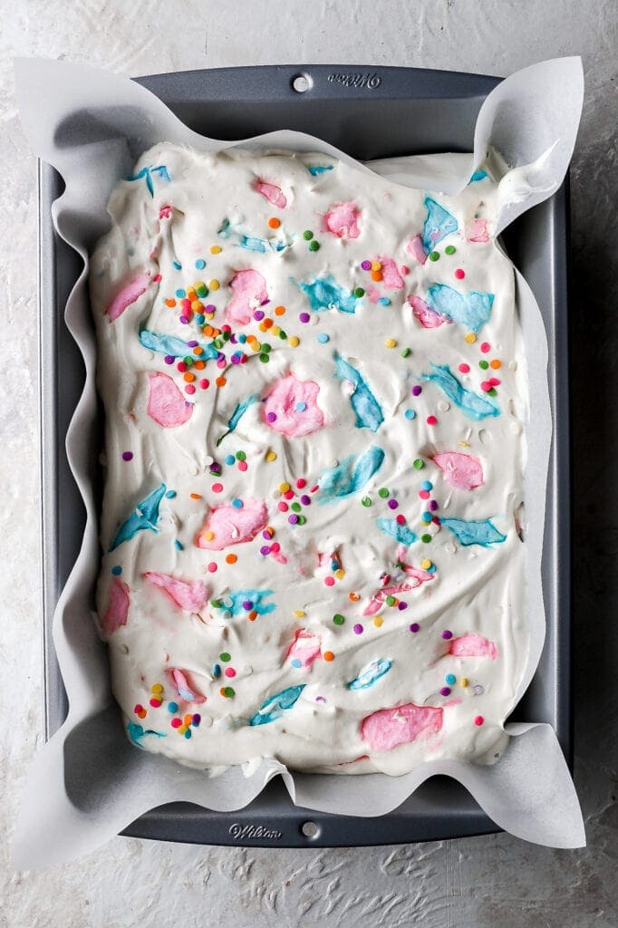 Fold in the sprinkles, if using. Spread half of the ice cream into a container with a lid, place half of the cotton candy on top and then repeat with the rest. Top with extra sprinkles and freeze for at least 8 hours.