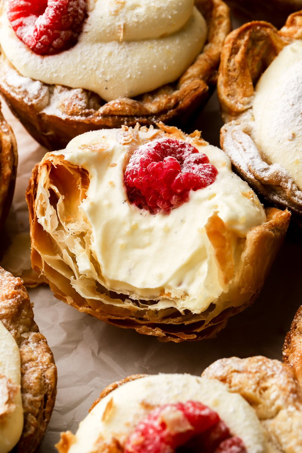 These cream tartlets are the mini version of my beloved Crรจmeschnitte. Crรจmeschnitte is a traditional European dessert that has two layers of puff pastry sandwiched around a vanilla custard filling (I used Bavarian Cream). I turned that into mini little tartlets and topped them with some fruit.