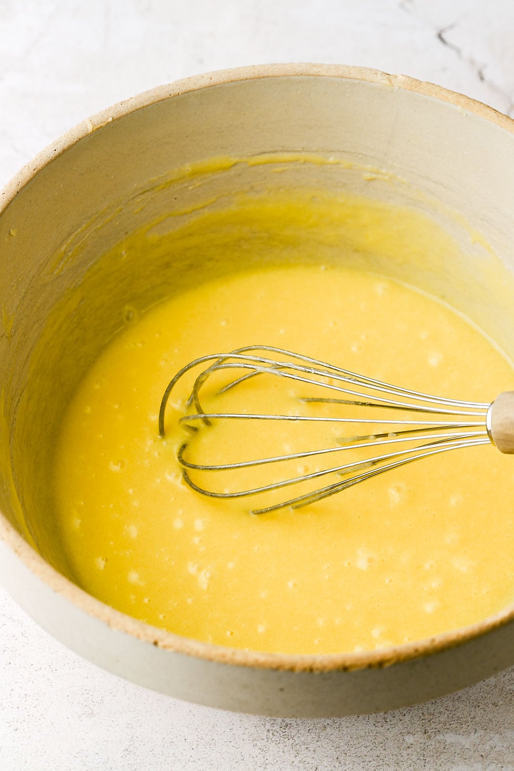 - Whisk together the melted butter and sugar: let the butter cool a little before combining with the sugar.