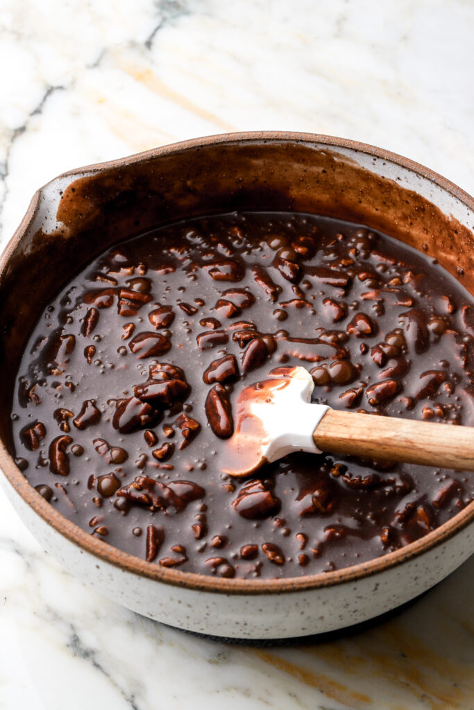 Step 3: Stir in the pecans and chocolate chips and toss them around until theyโre evenly coated with the chocolate mixture.