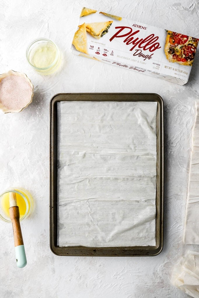 top layer of phyllo dough with egg whites and cinnamon sugar
