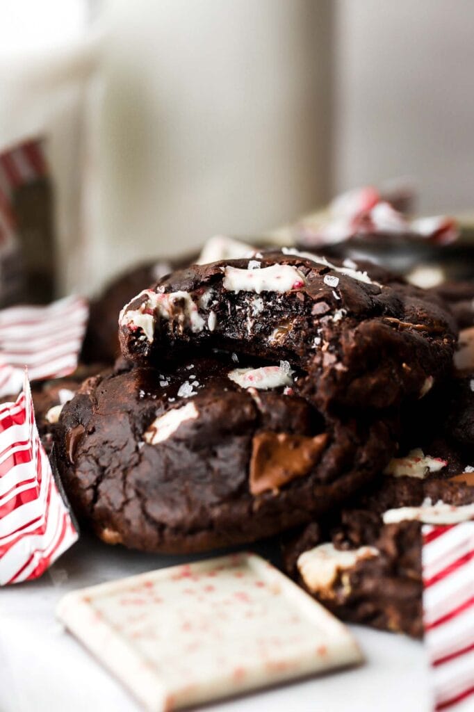 These chocolate peppermint cookies are nothing short of a dark and rich brownie in cookie form, stuffed with Ghirardelli peppermint chocolate bark.ย