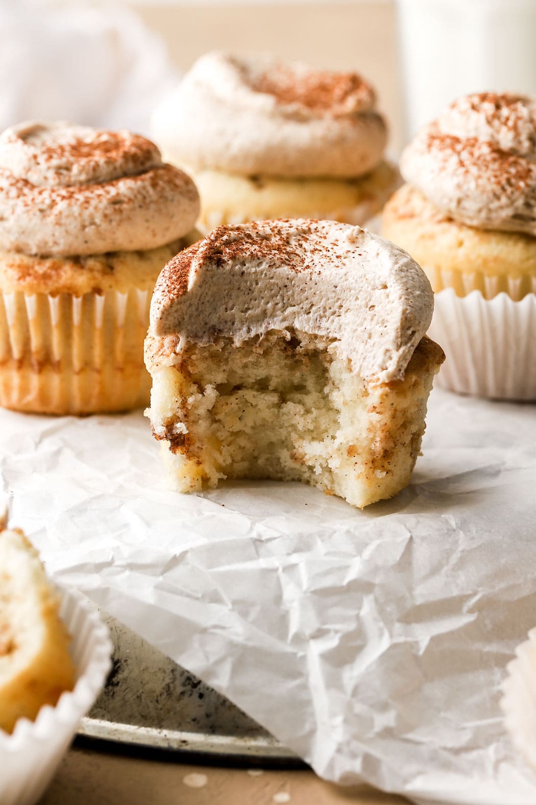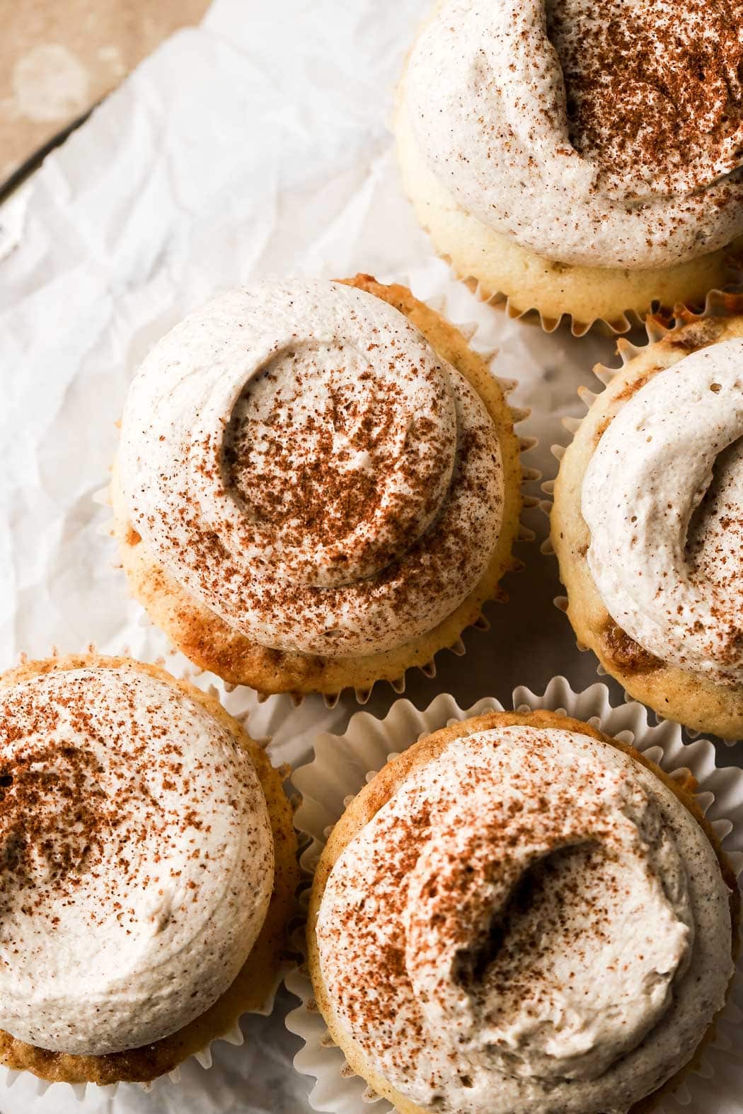 - I used real vanilla beans in the cupcake batter and highlighted the cinnamon with a brown sugar cinnamon swirl throughout. The flavors complement each other so well and it makes the cupcake flavor and texture much more interesting than a plain cinnamon cupcake.
