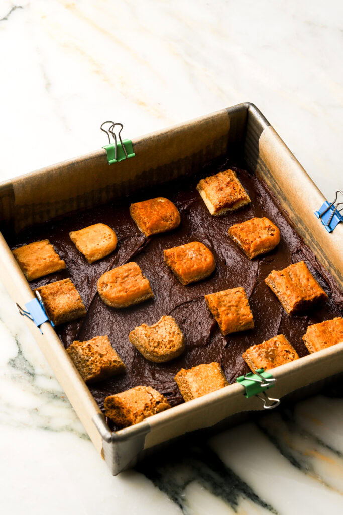 - Dip the chunks of lady fingers in espresso and layer them with the brownie batter.