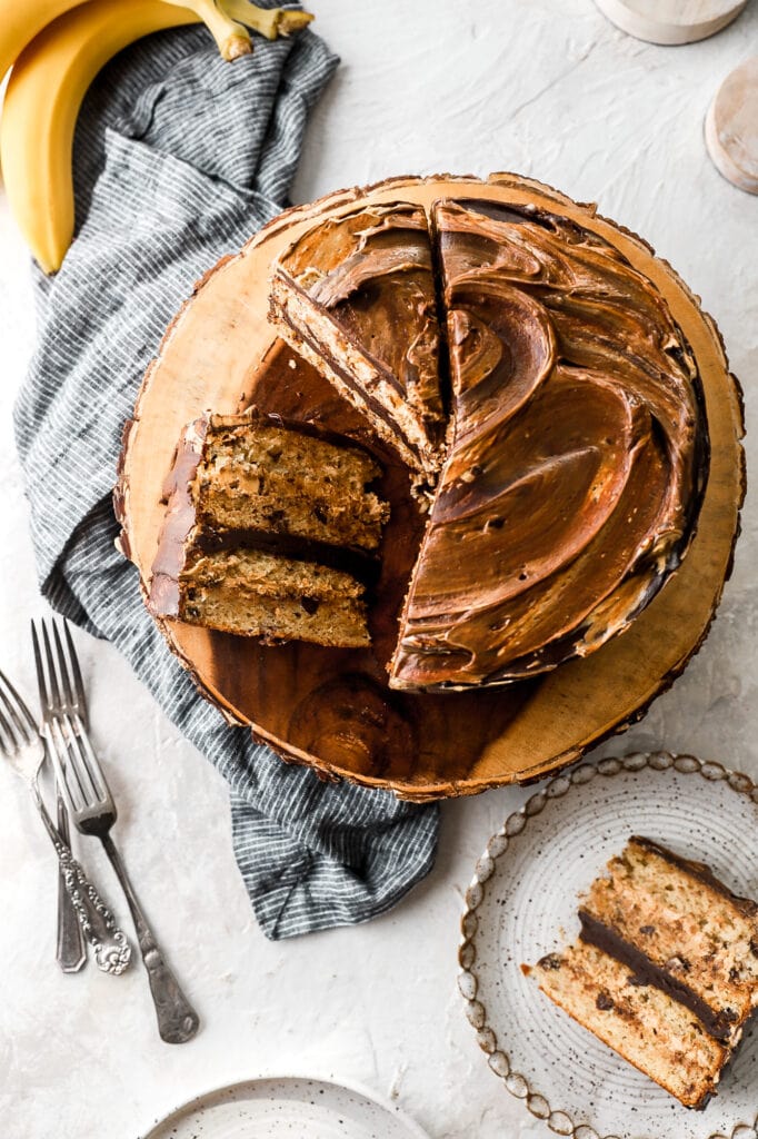 Chocolate peanut butter banana cake has chocolate chip banana cake layers and is frosted with creamy peanut butter Swiss meringue buttercream and dark chocolate ganache!