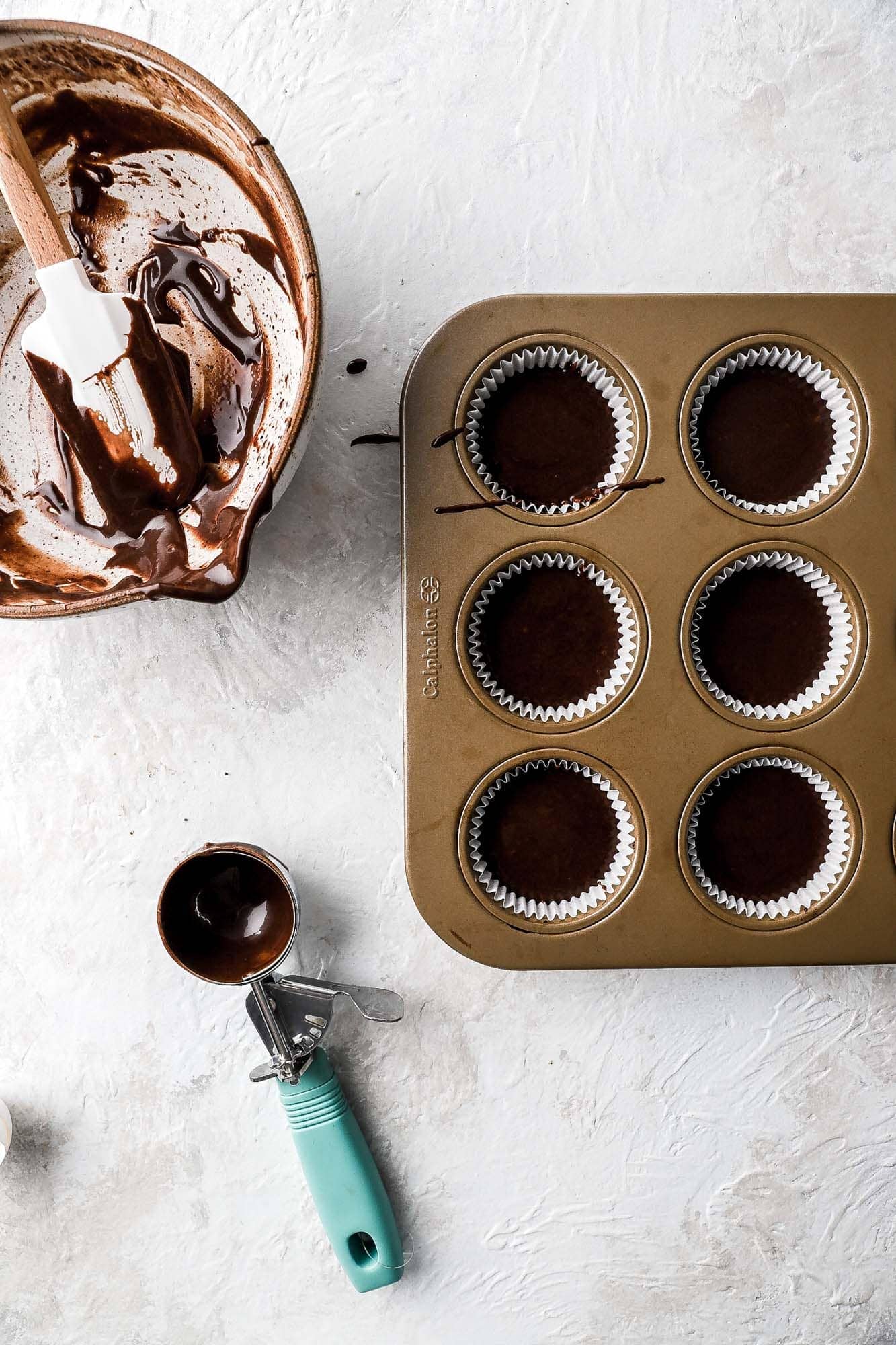 Step 5: Scrape the edge of the bowl and give it a good mix. Fill the cupcake liners about โ -ยพ full. I recommend weighing them so each cupcake has 50-55 grams of batter.