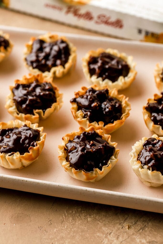 The filling in my Chocolate Praline Mini Pies has all the best flavors- salted caramel, chocolate, pecans, and whipping cream to make it extra creamy. It takes 2 simple steps to make it. Over medium heat combine the caramel, chocolate, and heavy whipping cream. Then you remove and add the chopped toasted pecans and they are ready! This recipe makes a little more than enough filling for a box of Phyllo Shells (there are 15 in a box). You can get away with 20-25 depending on how much you fill them. If you do want to make more than 15, simply double the caramel whipped cream recipe.